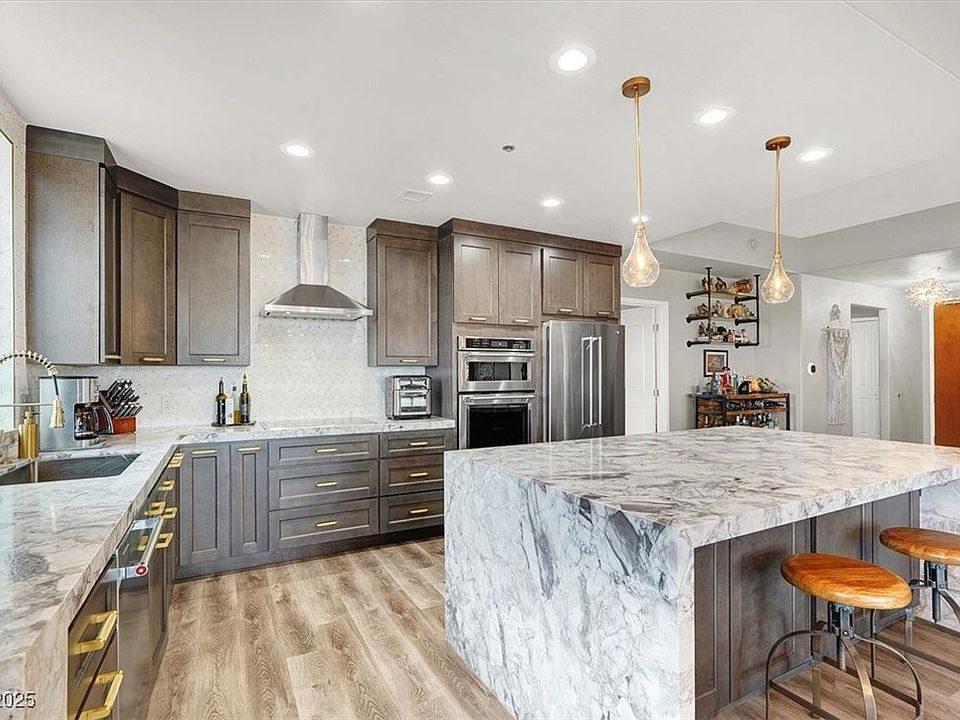 Discover luxury living in this beautifully remodeled high-rise 2 bed + den, 3 bath condo with STRIP VIEWS! Every detail has been thoughtfully updated, luxury vinyl plank flooring throughout, chef-style kitchen with gorgeous marble countertops with waterfall island, top of the line stainless appliances with induction cooktop and wine fridge, tons of storage and custom backsplash. Primary bedroom with private balcony has custom built-in's for additional closet space, and a spa inspired bathroom with walk-in shower and vanity. Large secondary bedroom with en-suite and huge custom closet. Great room is perfect for entertaining, there are 2 huge sliding doors that lead to a balcony with stunning views of the valley, mountains, and the strip! Two assigned parking spaces and an 11x7 climate controlled storage unit are included, not to mention 24/7 resort style amenities, including concierge, security, 2 story fitness center, pool/spa, dog parks, and so much more!