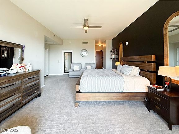 HIGHLY SOUGHT AFTER 19TH FLOOR END UNIT W/ STUNNING VIEWS FROM 3 SPECTACULAR BALCONIES! 3/BR 3/BA. PRIMARY & JR SUITES BOTH HAVE PRIVATE BALCONIES ALONG W/ A 3RD BEDROOM & GUEST BATH. PRIMARY SUITE HAS ITS OWN PRIVATE ENTRANCE FROM HALL, HUGE WALK IN CLOSET & RESORT LIKE BATHROOM W/ SEPARATE SOAKING TUB & SHOWER. PLANK TILE FLOORING THROUGHOUT & PLUSH UPGRADED CARPET IN BEDROOMS. KITCHEN BOASTS QUARTZ COUNTERTOPS, LARGE KITCHEN ISLAND W/ BREAKFAST BAR, TOP OF THE LINE APPLIANCES, CERAMIC GLASS BACKSPLASH & AMPLE CABINETRY. EXPANSIVE GREAT ROOM W/ DINING AREA, DEN & 2 SLIDERS TO THE MAIN BALCONY. LAUNDRY W/ SINK & CABINETS/CLOSET. THIS UNIT COMES WITH 2 PARKING SPACES & A STORAGE UNIT. CLOSE TO THE RAIDERS STADIUM, TOWN SQUARE, SOUTH POINT CASINO & QUICK ACCESS TO THE I15 & BLUE DIAMOND. DON'T MISS OUT ON THIS AMAZING OPPORTUNITY! HOA COVERS COX CABLE, WATER, TRASH, SEWER, PARKING SPACES AND STORAGE ALONG W/ AMPLE AMENITIES MAKING THIS HOME AN ALL INCLUSIVE LIFESTYLE.