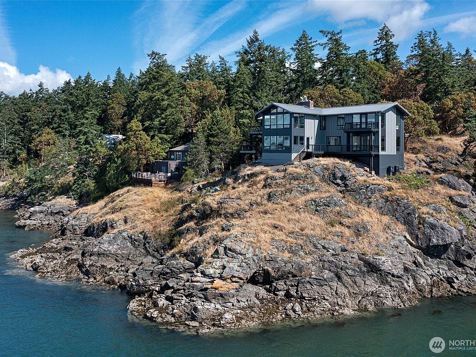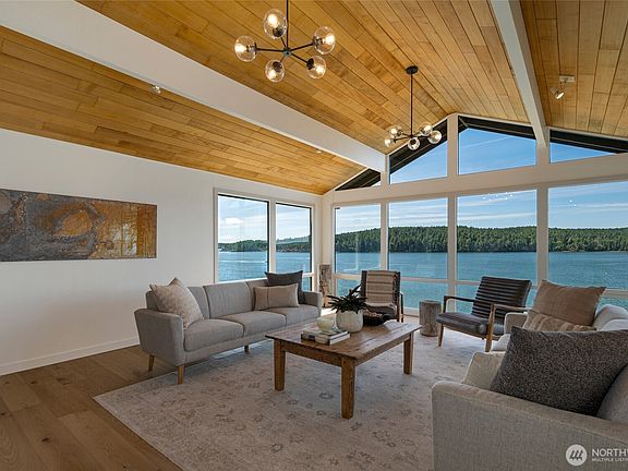 Perched at the point in Orcas Village, this iconic 5BD/4BA waterfront home has been meticulously remodeled with designer finishes, offering the feeling of brand-new construction. Set on .88 acres with 345+/- ft of shoreline and sweeping views over Cayou Channel to Blind Bay, enjoy ferry crossings, boating activity, and glowing southwest light through floor-to-ceiling windows. With 3411 sf, primary suites on both levels, 2 bonus rooms, 2 woodburning fireplaces, and thoughtful upgrades throughout the home blends elegance with comfort. Launch a kayak or fish from your own shoreline. With public water/sewer and just steps to the ferry, county dock, groceries, dining, and shops-this rare retreat combines luxury living with everyday convenience.