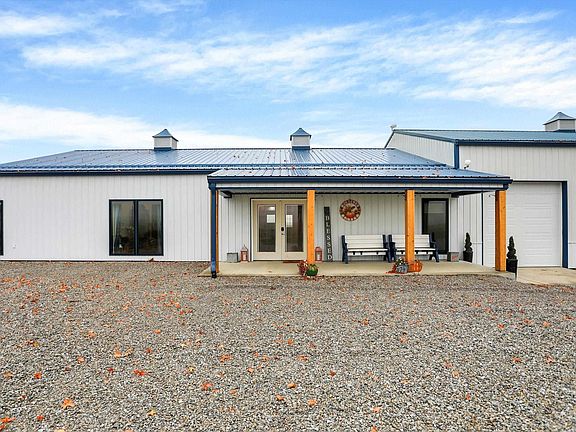 This exceptional 2-year-old barndominium offers modern country living on 5 private acres just a few miles from I-70, giving you peaceful rural surroundings with only a 20-minute drive to Indianapolis. The 2,240 sq ft interior features 3 bedrooms and 2 full bathrooms, highlighted by a spacious kitchen with a striking 4' x 10' quartz island and stainless steel appliances. Radiant heated floors and upgraded insulation ensure outstanding energy efficiency throughout the home. The luxurious primary suite includes a stunning European-style wet room, and the entire home is ADA compliant for ease of accessibility. Ideal for hobbyists or professionals, the property includes 2,400 sq ft of attached garage space—1,200 sq ft climate-controlled and 1,200 sq ft cold storage—as well as an additional detached garage. This rare offering blends comfort, quality, and convenience in a highly desirable location.