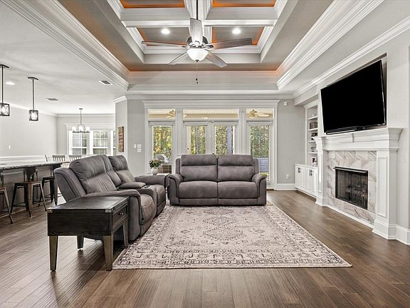 Gas fireplaceCraftsman-style homeGranite countertopsCustom finishesOpen floor planEngineered hardwood floorsTray ceiling