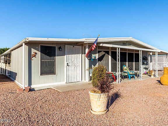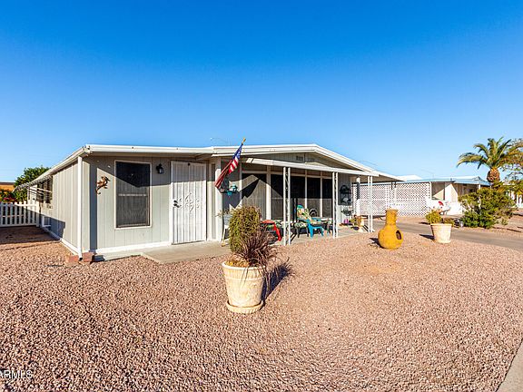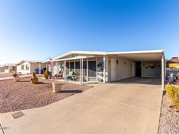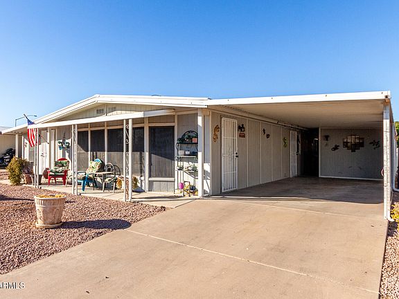 Welcome to this charming 2-bedroom manufactured home in the adult Community of Fountain of the Sun! You're greeted by a tandem carport, an inviting front patio, and an easy-care yard. The serene living room features a soothing palette, blinds, and warm wood flooring. Create lasting memories in the family room, complete with contemporary track lighting and plush carpeting for added comfort. The eat-in kitchen comes with abundant wood cabinetry and essential built-in appliances for an enjoyable cooking experience. Both bedrooms offer well-appointed bathrooms and closets with mirrored doors that enhance the sense of space. Unwind in the lovely backyard, boasting an open patio, stylish pavers, pristine artificial turf, and fragrant citrus trees for Mediterranean charm. Make it yours now!