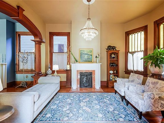 Fabulous new price for this Victorian jewel. This home exudes historical character and craftmanship. The moment you step through the front doors you are welcomed by a custom, hand painted mural in the foyer, working pocket doors to the formal parlor and an archway with columns to the dining room, both outfitted with fireplaces and mantels, and a grand staircase with an impressive newel post and banister.