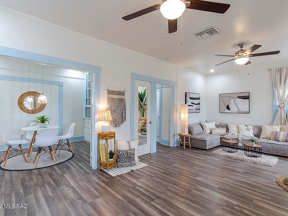Look no further! This beautiful single-level home is loaded with opportunity! Make it your beautiful home or use as an investment property close to UofA w/ R-3 Zoning, or BOTH! Large front porch where you can enjoy relaxing sunsets. Charming interior with new wood-look flooring, designer paint, luxurious light fixtures, and lots of natural light! The formal dining room has French doors and built-in cabinet. Bright kitchen with subway tile backsplash, SS appliances, recessed lighting, wood cabinets, and plenty of granite counter space. In one bedroom you'll find a sitting room with patio access and a walk-in closet. Huge backyard has a nice storage shed, mental RV gate/fence. Add a guest house or two, and collect rental income while occupying the main house. Seller is Licensed Broker in AZ.