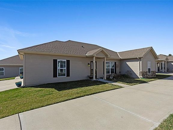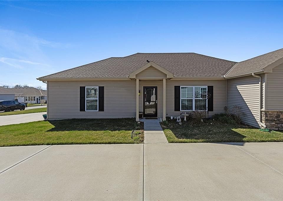 One level living in THE RANCH VILLAS AT SANTERRA WITH A PRIVATE DRIVE! This one will not last long! Maintenance free living in the heart of Gladstone! This home has been immaculately maintained with several upgrades making this stand out as YOUR next home! Upgraded light fixtures and ceiling fans throughout, as well as upgraded carpet and padding. Owner has installed glass shower doors and custom tile in bathrooms, invisible pet fence and sprinkler system for even less maintenance. The kitchen features hardwood flooring, granite counter tops and wood cabinetry along with a spacious dining area adjacent to the covered patio/porch. Entering the home from the garage you'll find built in bench and storage with the laundry room adjacent. Hanging tool storage in garage stays! HOA includes snow removal, lawn maintenance, & trash pick up. The Clubhouse features a gym facility and meeting room. Minutes to entertainment, dining, medical and shopping.