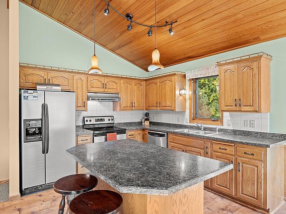 Quality 4 Bedroom 3 bath home. 2 Beautiful brick wood burning fireplaces, vaulted ceilings, stainless steel appliances, movable center island, master bath, walk-in closet, open spacious kitchen with plenty of storage and a walkout onto the deck. Oversized 34x24 heated and insulated garage, with hot and cold running water, floor drain and a pull down attic for extra storage. Large lower level family room with a walkout onto the patio, back yard with a raised garden. Enjoy the large front porch.