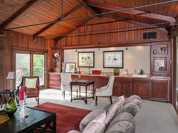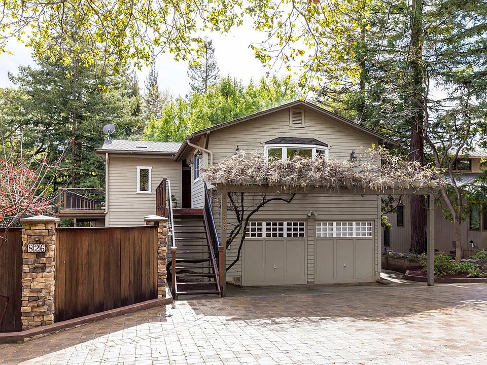 Beautifully restored circa 1920s home in a secluded location on a private lane in the Country Club area. Dramatic living room features a towering cathedral ceiling with iron trusses and walls all finished in original Douglas fir, new carpet, and entertainment bar with Sub-Zero refrigerator and marble slab countertop. Formal dining room is an open space between the living room and kitchen. Large gourmet kitchen with beautifully appointed cherry cabinetry, island with counter seating, granite slab countertops, tumbled stone backsplashes, and top-of-the-line stainless steel appliances. Lower-level family room with sliding glass doors to the side terrace and pool. Master bedroom suite with hardwood floors, two double-door customized closets and deck overlooking the creek. Vast entertainment deck. Expansive gardens and sun-swept pool. Excellent location exceptionally close to shopping, commute routes to Apple, Google and Stanford and close proximity to the Open Space Preserve.