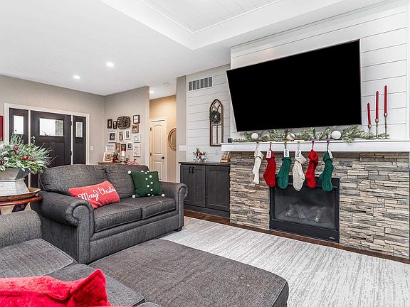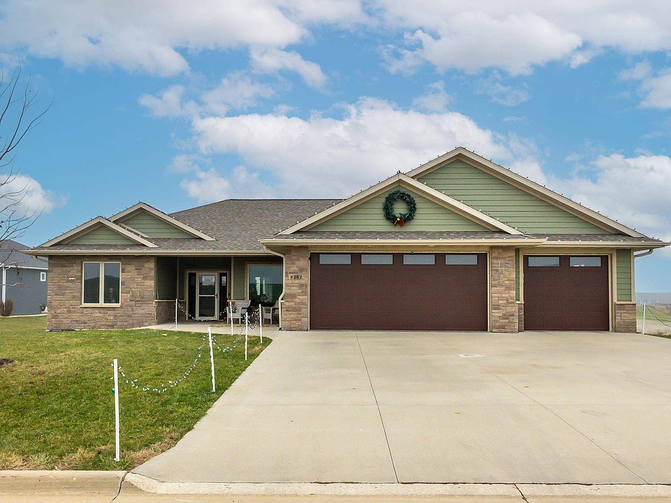 Located in Peosta, this quality-built home offers 5 bedrooms, 3.5 baths, and thoughtful details throughout. The open split-bedroom layout features no-step entry, hardwood floors, and 9-foot ceilings with 10-foot tray accents. The spacious kitchen includes white cabinetry, granite counters, stainless steel appliances, a large island, and convenient main-floor laundry nearby. The living area is warm and inviting with a beautiful fireplace. A 14x12 covered deck, a welcoming front porch, and large patio provide great outdoor spaces to relax. The primary suite includes a tiled walk-in shower and stylish finishes. The finished walkout lower level adds valuable living space with a family room, second fireplace, additional bedrooms, full bath, and access to a lower-level garage. With upgraded exterior siding and exceptional craftsmanship, this Peosta home blends comfort, function, and beautiful design.