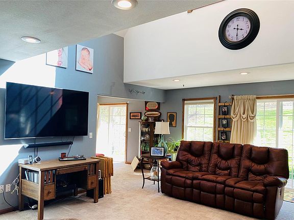 One owner, custom built 1.5 story home sits on 3.3 acres with a tree lined driveway on the edge of town is ready for you. Approx 2400 sq feet of living space. The openness is great for entertaining your family & friends. The windows draw plenty of natural light and high ceilings add to the sense of space, making this home both roomy and cozy. The kitchen offers granite counter tops stainless appliances and the island is moveable. There’s a quiet sitting room off the living room with sliding glass doors that access the patio. Main floor master suite with walk-in closet and full bath w/soaking tub & glass shower. Two large bedrooms upstairs-each with walk-in closets. Unfinished basement has many possibilities with a 84” exterior door. 3 exterior living spaces, wrap around front porch, back patio with stamped contract, and covered side porch on the garage side. Outbuilding with mini split system & 10’ ceiling. Zoned geothermal, roof 2023, buried utilities. Must see~beautiful setting.