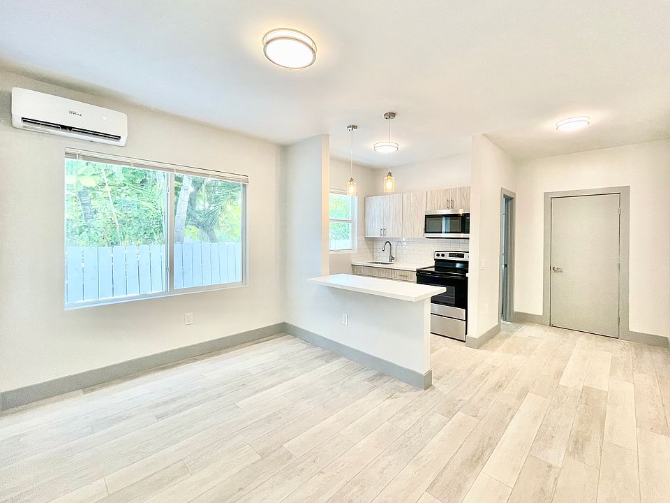 Beautifully remodeled 1 bedroom apartment located on the ground level of a secured building in the hip Little River neighborhood, just minutes walk from new retail developments and Oakland Grove Mini Park. This airy apartment features an open floor plan with plenty sunlight, hardwood kitchen cabinets, quartz countertops, eat-in kitchen, stainless steel appliances, energy-efficient mini split A/C units and hurricane rated windows!