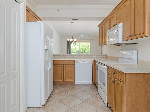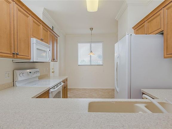 BEST LOCATION IN TOWN! RIVERWALK - off College Parkway. Rare opportunity to own a 3rd floor unit, 2 bedrooms, 2 bath, spotless clean and move-in ready. Diagonal tiles throughout the Interior with carpet in bedrooms. Crown molding in the living/kitchen area. Kitchen with breakfast nook and breakfast bar. New interior paint throughout, new carpet in bedrooms. Master bedroom with en-suite bath and 2 walk-in closets. In unit laundry with washer and dryer. New A/C in 2018, separate storage unit across from elevator, 1 car carport in front of building close to elevator. Plenty of guest parking. Screened lanai - you feel like being in a tree house with view to tranquil wooded area. A centrally located, quiet and well maintained community with low HOA fees, extra large community Club House, new equipment at the Gym and a lovely resort style pool area overlooking a lake. Take advantage of interest rates being still historically low.
