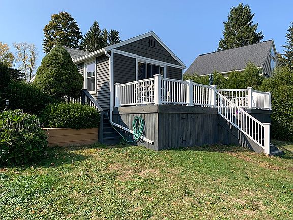 COTTAGE COMPLETELY RENOVATED THROUGHOUT in 2020, new appliances, new vinyl windows, new vinyl siding & situated on 50 feet of PRIME BAYFRONT with PERMANENT DOCK & STONE BREAKWALL! FANTASTIC WATER VIEWS from the LARGE DECK. This 3 season cottage is a low maintenance since all the work has been completed and in turn key condition. Furnishings included (except personal items & shed contents). This 2 bedroom cottage can sleep 8. All furniture in excellent condition. Window A/C, electric wall units for heating. Enjoy a lifetime of fun on PORT BAY with channel access to LAKE ONTARIO where there is some of the best fishing, swimming and boating activities around! The PORT BAY FIREWORKS are amazing at this location! Ample parking on the recent gravel driveway. Shed has loft and shelves for your storage needs. Separate RV hookup’s for water, sewer, and electric. PUBLIC WATER & SEWERS CONNECTED. Great neighborhood of homes!