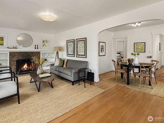 Light-filled Maple Leaf home set on west-facing corner lot! Gleaming refinished oak floors throughout. The spacious living room is filled with natural light and features a fireplace with Batchelder-style tile, built-ins, and original millwork. A graceful archway leads to a dining area and vintage kitchen with butcher block counters. The main floor offers two bedrooms—one with a private deck—and a hall bath updated with classic white tile floors. The partially finished basement provides flex space for office, gym, or TV. Outside: fenced backyard with mature trees and raised deck, sunny front yard for gardening, and a welcoming front porch. Garage plus driveway parking. Walkable to Greenlake, Maple Leaf Park, light rail, shops, & dining!