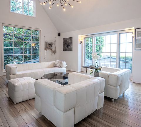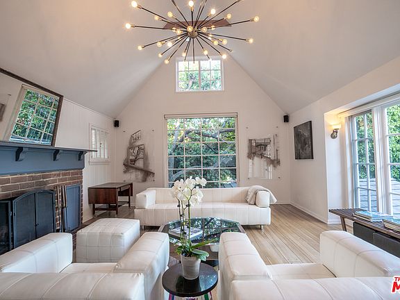 Dazzling City Views highlight the sensitive restoration of a 1944 Robert Byrd House above the famed Chateau Marmont. High Ceilings and large windows further enhance the private and picturesque setting. 2 bedrooms, office, 1.5 baths, plus attached 2-room Cottage, kitchenette and 1 bath guesthouse with a private entrance, separate art studio or gym with lush private gardens, period flagstone and cobbled brick terraces, stacked stone garden walls, lawn panels, complete the architect's vision. Furnished with a contemporary modern twist, highlights include: 70s designer restored leather living room furniture. Vintage light Fixtures of the 50s, and 60's adorn this GEM. Two car garage and plenty of street parking.