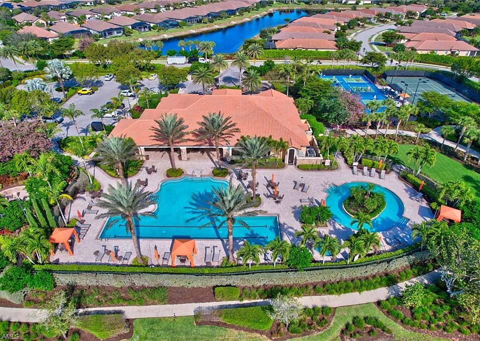 Discover an exquisite lakefront retreat, completed in December 2021, surrounded by beautiful landscaped front and rear grounds. This 2,373 sq. ft. single-family home embodies the coveted Lazio open-floor plan, featuring 3 expansive bedrooms, 3 full bathrooms, a versatile den, and a delightful covered lanai. Encompassing 2,884 sq. ft., the property includes a lanai and patio enhanced by a built-in outdoor kitchen (gas). Notable features include premium lanai storm/hurricane protection screens, rich hardwood flooring throughout, elegant bay windows in the master and guest bedrooms, a substantial walk-in closet, refined tray ceilings, and stylish recessed lighting. Nestled in a secure, gated, resort-style community, residents enjoy an impressive suite of amenities: a cutting-edge fitness center, welcoming community room, ping pong and pool tables, dedicated game and yoga rooms, a serene spa, a heated pool, a resistance lap pool, a charming poolside cabana, lounge chairs, umbrella tables, and abundant seating. Outdoor offerings shine with a warm fire pit, tennis courts, illuminated pickleball courts, bocce ball courts, a dog park, and a playground. Perfectly positioned near shopping, dining, medical facilities, entertainment, and pristine beaches. Only 2 miles from Publix grocery, 3 miles from a 24-hour Medical Center, and 1 mile from Gallery Hacienda Lakes—a premier full-service senior assisted living and memory care center. Explore nearby treasures such as the Naples Zoo and Botanical Gardens, Rookery Bay, and NGALA Wildlife Preserve.