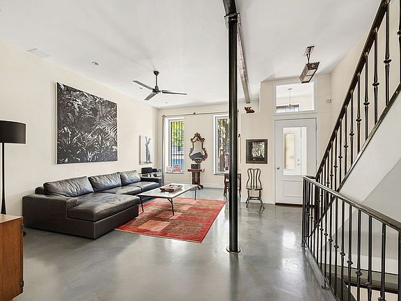Step into the upper triplex through a welcoming foyer leading to the parlor floor, where you'll find an expansive open-plan living area. The chef's kitchen is a focal point, equipped for culinary enthusiasts, and is complemented by a convenient powder room and a spacious pantry. This home is adorned with striking industrial details, including elegant iron railings on the staircase, exposed beams, and unique epoxy resin flooring. These elements harmoniously blend with the soaring high ceilings, creating an open and inviting atmosphere perfect for both relaxation and entertainment.