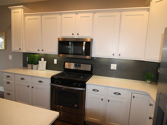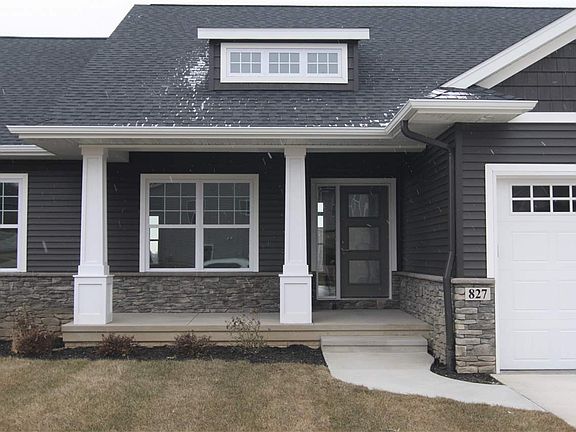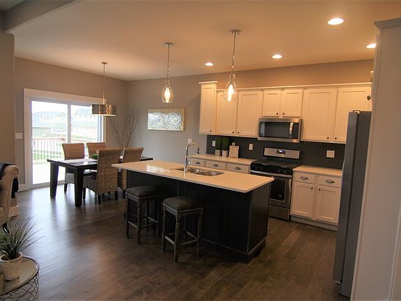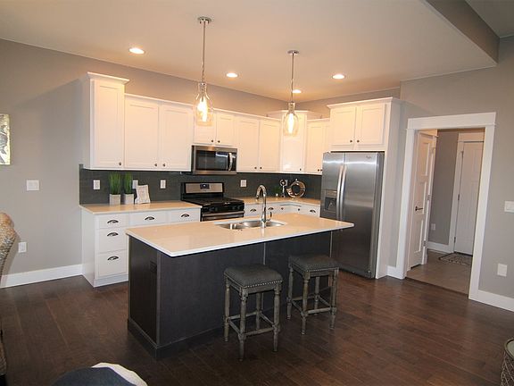 Featuring Birch hardwood flooring through the foyer, kitchen, great room & hallway, a stone surround gas fireplace, large center island, quartz counters, pantry, under cabinet lighting, gas range, separate laundry room & drop zone lockers. White perimeter kitchen cabinets, dark island, gray vanities. Master bath has quartz counters, a custom ceramic shower. You'll love the spacious walk out lower level with the kitchenette wet bar.