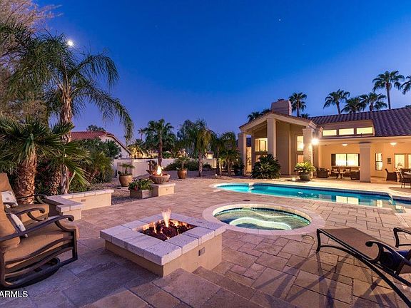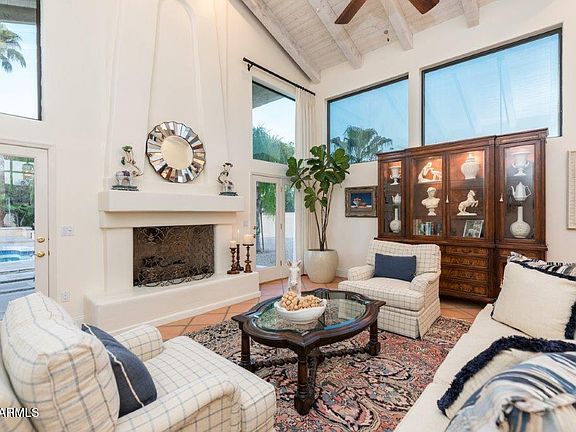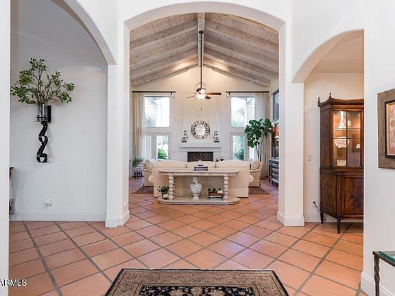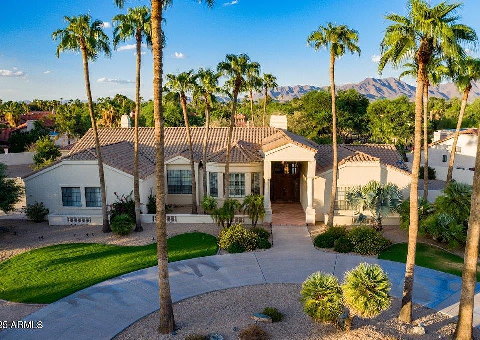 This serene Santa Barbara inspired estate is nestled in the exclusive Villa Capistrano neighborhood in the Cactus Corridor. This pristine pocket in central Scottsdale is home to multi-million dollar luxury residences. The timeless architecture is surrounded by soaring palm trees on a near acre, with a separate guest house complete with a kitchen, living room and large ensuite bedroom. As you enter the main house, you immediately see the towering wood-beam ceilings anchored by a floor to ceiling fireplace. This ideal split floor plan features 4 bedrooms in the main house & 4 and a half baths with the guest house. Bask in the glow of the fireplace in the primary suite with an expansive and spa like bath. Natural light streams into the eat-in kitchen with a large window peering out to the resort style backyard with a fire pit, pool, spa and fountains. In front, it features a massive circle driveway and separate driveway leading to a 3-car garage on this expansive .88% of an acre! This pocket ideally situated in the Cactus Corridor is just minutes from dining and shopping at Kierland, The Quarter and north Scottsdale...while being conveniently located by the 101 freeway to head downtown, to the airport or sports events. Finally, Villa Capistrano features one way in and one way out...the gated-like feel without the high HOA fees! Don't miss this timeless estate!