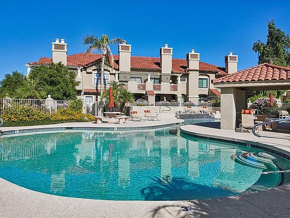 Experience resort-style living in the heart of McCormick Ranch with this stunning pool-view residence in the highly sought-after gated community of Palm Cove. Newer carpet, fresh paint, new chandelier, newer washer & dryer, attached 1 garage & newer HVAC. This home perfectly blends comfort, style, and convenience. Wake up to serene lake views surrounded by 28 miles of greenbelt walking paths, lush landscaping, and mountain backdrops. Minutes from Loop 101, restaurants, golf, spring training, cafes, shops, top-rated schools like Chaparral High. The open-concept layout features soaring ceilings, cozy fireplace, and plantation shutters throughout. Enjoy a spacious private balcony perfect for morning coffee or evening relaxation. The community has two sparkling pools & recreation activities. The exquisite primary suite offers a true retreat with modern lighting, dual vanities, a large walk-in closet, a glass-enclosed tile shower, and a luxurious soaking tub.