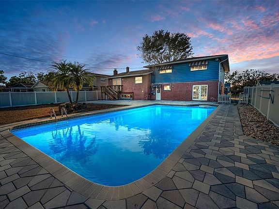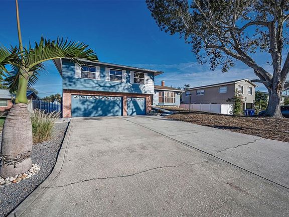 Welcome to your own piece of paradise near the end of a quiet cul-de-sac in a desirable beachside community. This beautifully maintained 3,000 sq. ft. home offers the perfect combination of space, comfort, and location just minutes from the Gulf. The spacious owner’s suite features two walk-in closets and a luxurious bath with Italian marble floors, dual granite vanities, a jetted soaking tub, and a walk-in glass shower. Two additional bedrooms on the upper level share a full bath with double vanity. Carpet has been removed in the primary and second bedrooms on the third level, ready for new flooring. The garden-level suite offers French doors overlooking the pool and access to a full bath, ideal for guests, in-laws, or a private home office. The main level showcases an open floor plan that flows from the kitchen to the dining and living areas, creating an inviting space for entertaining. The kitchen includes solid hardwood cabinetry, granite countertops, a large center island, and abundant storage. The living room features a wood-burning fireplace and plenty of natural light. The daylight basement provides additional living space perfect for movie nights or game day gatherings. A custom-built Birdseye maple bar with granite counters, wine chiller, ice maker, and a second wood-burning fireplace make this level a standout feature of the home. Quality upgrades can be found throughout, including plantation shutters in every room, solid hardwood doors with upgraded hardware, and crown molding in most areas. Step outside to your private backyard retreat featuring a 20x40 pool with in-pool table and seating. Both the front and backyards provide generous green space, ready for the new owner to customize and design to their personal taste. Additional highlights include a three-car garage with a wide driveway for extra parking. The home is located in a high and dry, non-evacuation zone, with no flood insurance required. Walking distance to Bauder Elementary and Seminole schools, and only minutes to the beautiful Gulf beaches. Enjoy the Florida lifestyle in this spacious coastal home designed for comfort, entertaining, and relaxation.