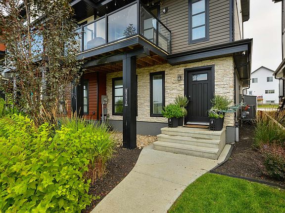 End-unit with 3+1 beds, 3 baths, A/C and PARK/LAKE VIEWS, and NO FEES! EXTENSIVE green space sits directly across the street: your family’s playground for dog walks, scooters, and post-work resets. Bordering the Whitemud Creek Ravine and facing its restored conservation area, enjoy trails, wildlife, and open air. An elevated deck looks over the green space and lake: perfect from morning coffee to sunset suppers. Inside, a modern linear kitchen has stone counters, upgraded cabinets/appliances, a glass-wall, and designer lighting. Custom wall details and a SHOWPIECE TV area with decor shelves and lime-wash finish add warmth. Upstairs, the primary features a STEAM SHOWER; bedroom-level laundry keeps routines easy. Lower level adds a bedroom/office or gym, with matte-black hardware elevating every touch. Upgraded garage storage becomes a gear hub: bikes and lake-day kits,ideal with the park at your door. Walk to SCHOOL, grocery, and shops; take advantage of the recent interest-rate drop and make this HOME!