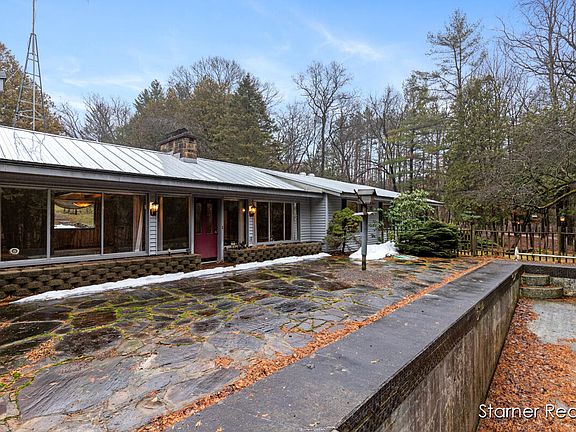 Mid Century Modern - Unlock the potential of this, circa 1948, Mid Century Modern home. Overlooking a spectacular four acre site of woods, ravines, a meadow (with old horse barn), several meandering creeks, even a small waterfall & pond. Although visually dated; this estate property presents as well maintained and sound. Comfortable and functional as is, your designer's eye will none the less see the opportunity to bring up to the minute modern design to this prime location. Enter the front door, from the courtyard by the pool, to the four season porch with flagstone floor. Next, open to both the kitchen & porch, is the large formal dining room featuring an elevated fireplace and large picture window with a view to the spacious back yard. Beyond the dining room is a dramatic living room with a soaring beamed ceiling, real redwood walls, a brick, floor to ceiling fireplace wall, and large window walls that connect you to nature and the beauty of this site. Passing back through the kitchen is the bedroom wing of the house offering four bedrooms, one with a fireplace, and three full baths. There are also utility rooms, storage and an attached garage. There is a lot to see here and a lot of potential. Don't miss this opportunity to create a dynamic modern house on a very special site. Easy to view. Call today!