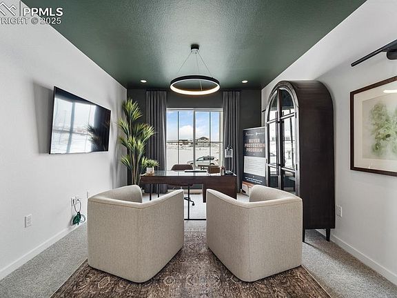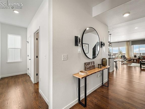 Experience luxury living in this stunning Vantage Homes model, perfectly positioned to capture breathtaking, unobstructed views of Pikes Peak. Located in the highly sought-after School District 20, this meticulously crafted home offers a rare combination of designer finishes, functional elegance, and outdoor beauty. Step inside to soaring ceilings, expansive windows, and an open-concept floor plan that fills the home with natural light and showcases the mountain vistas from nearly every room. Thoughtfully designed upgrades include gourmet kitchen appliances, quartz countertops, custom cabinetry, luxury plank flooring, and a spa-inspired master bath delivering both style and comfort. Entertain effortlessly in the spacious living and dining areas, or take the party outside to your fully landscaped backyard oasis. With a covered patio, professionally designed landscaping, and uninterrupted views, the outdoor space is an extension of the home’s high-end design. From top-rated schools and nearby trails to modern amenities and a vibrant community, this home offers not just a place to live but a Colorado lifestyle worth investing in. With builder warranties, turnkey condition, and model-quality finishes, this home won’t stay on the market long. Schedule your private tour today- this is the one you’ve been waiting for.