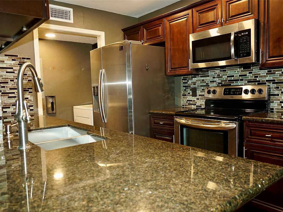 Charming 1-bedroom home with a spacious loft on the second floor featuring vaulted ceilings and an open floor plan perfect for entertaining. Enjoy serene golf course views from the living area or patio. Recent upgrades include new flooring throughout the living, dining, kitchen, bath, and bedroom. The remodeled kitchen offers new cabinetry, granite countertops, stylish backsplash, and updated appliances, with washer and dryer included. The primary bedroom features a walk-in closet, while the bathroom has been completely renovated with wall-to-wall tile, new shower, toilet, vanity, and flooring. Fresh interior paint and updated patio railings add to the move-in ready appeal. The versatile loft makes a great entertainment space or additional sleeping area. This home combines comfort and style, ready for its new owner to make it their own. Buyers are encouraged to independently verify all information, including room sizes.