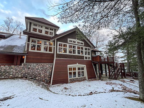 Executive 6,766 sqft home on Lake Kawaguesaga w/ WET BOATHOUSE! Part of the premier Minocqua Chain of Lakes featuring 6000ac of water recreation & many restaurants/bars navigable by boat. 283'+/- of sandy frontage and 1.12 acres. The main home boasts 5 fireplaces, 5 spacious BRs &, 5BAs including an "apartment" with a full bath, laundry, kitchen, and living area, offering a convenient space for extended family and guests. The high-end finishes throughout the property reflect a commitment to quality and craftsmanship, creating an atmosphere of timeless elegance. Whether you're entertaining guests on the lakeside wrap-around deck/patio or the roof of the wet boathouse, the unparalleled vistas of Lake Kawaguesaga enhance every moment. The southwest-facing views of the virgin forest owned by the University of Wisconsin offer a true Northwoods lake life experience. In addition, this gorgeous home has the zoning ability for a guest house if desired by the new owner. Come see it today!