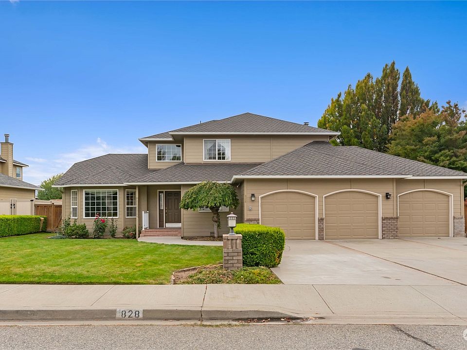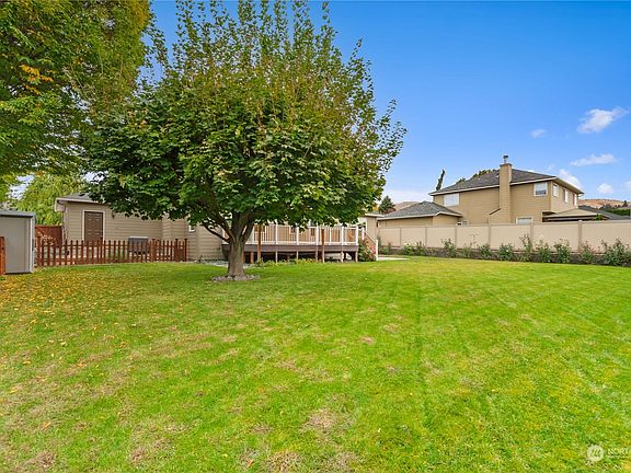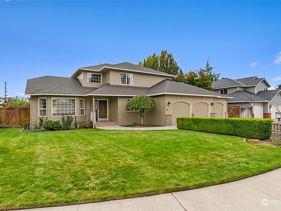 Traditional, gracious two story at the end of a pretty culdesac only blocks from Eastmont Junior High. Beautiful, mature landscaping includes perennials and shade trees all irrigated with irrigation water. Full quality exterior paint completed 9/2024 with siding replacement as needed. Spacious deck to the south with an electric sun shade for summer enjoyment in fully fenced backyard with garden shed. Three full garage door garage has built in quality storage and a bay with a cabinet unit that can be removed or stay. Main level office with built ins. Kitchen full of custom cabinetry and a wall of pull out drawer pantry/storage space. Upper level offers primary, two additional bedrooms, main bath and luxury master bath and closet.