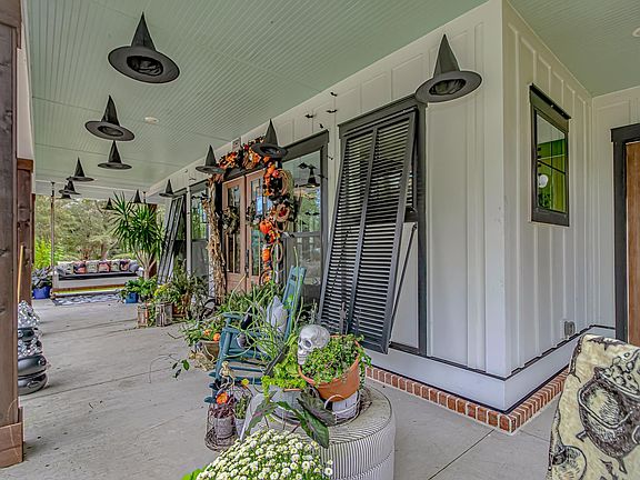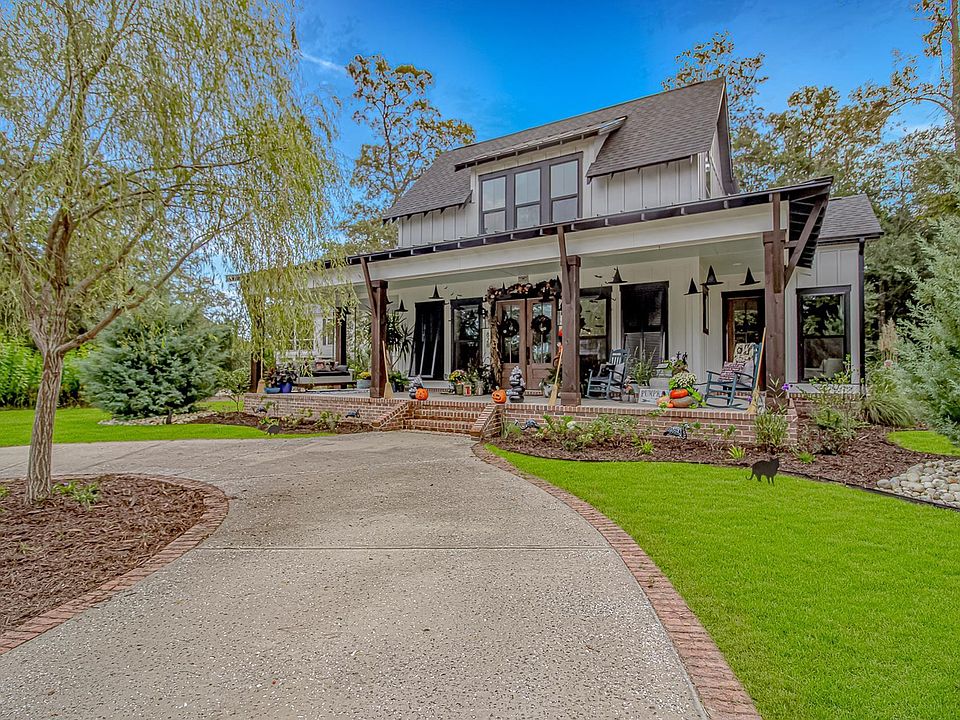 Nestled east of Highway 17, this Southern custom coastal farmhouse exudes charm and elegance. The home features four spacious bedrooms and 3 1/2 baths, perfect for family living and entertaining guests. A circular driveway welcomes you to this beautiful property, setting the stage for the warmth and sophistication found inside. Enter through 8-foot solid wood doors into the open floorplan, designed for modern living, with a seamless flow between the living spaces. The heart of the home is the kitchen, boasting double ovens and a gas stove, ideal for culinary enthusiasts. Adjacent to the kitchen is a large laundry area, adding convenience to daily chores. Steps away, you will find the primary suite featuring a truly luxurious ensuite. Double vanities, water closet, and a tiled shower featuring a rain head and two additional sprayers for the best start to your day. Solid surface countertops and tiled showers throughout the home reflect quality craftsmanship and attention to detail. The living room is enhanced by a coffered ceiling and a cozy fireplace, creating a welcoming atmosphere. Step outside to the large screened-in porch, complete with brick flooring, perfect for enjoying the coastal breeze and relaxing outdoors. This home combines Southern charm with modern amenities, making it a true coastal farmhouse dream.