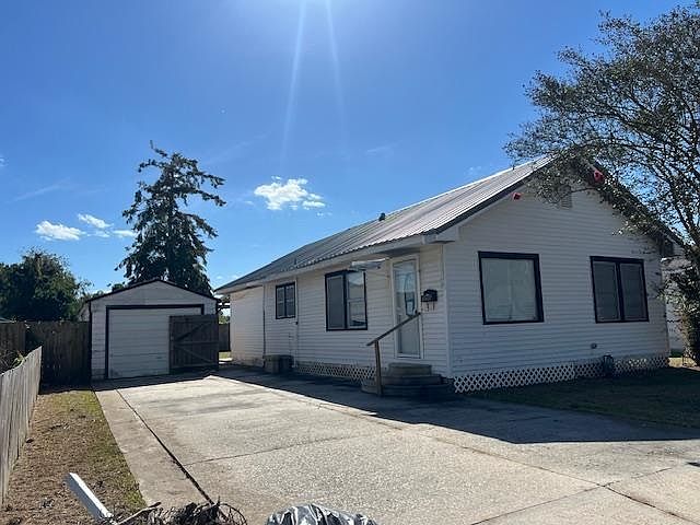 Central Houma cottage near Terrebonne General Hospital features 2 bedrooms and 1 bathroom, large open area kitchen and dining, covered rear patio, detached storage building, and wood fenced back yard.