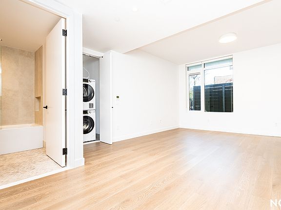 The primary bedroom has a huge closet and a stylish en-suite bathroom with earthy porcelain wall tiles paired with natural herringbone mosaic tile floors. There is also an imported Portuguese oak vanity with quartz countertop and a drop-in porcelain sink, matte black Grohe fixtures, and a Duravit soaking tub. The second bedroom has a large reach-in closet and easy access to a second full bathroom. The home also comes with a GE washer/dryer.
