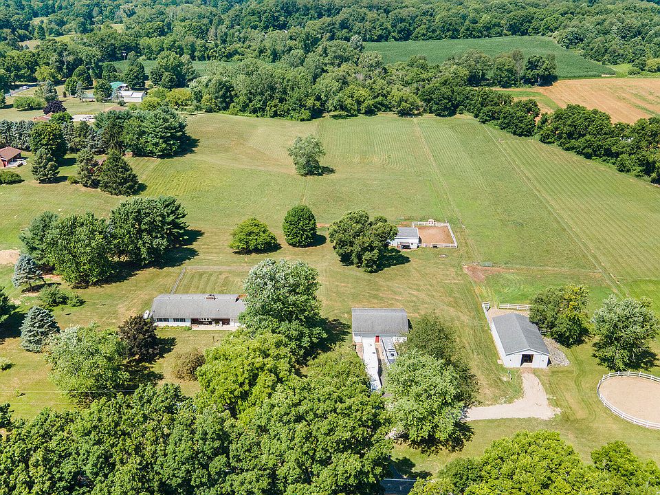 The attached 2-car garage is complemented by a 30x40 detached garage, fully insulated with electric, cement floors, and built-in storage, plus a dog run out back. The 30x48 pole barn features 3 stalls, a tack room, wash bay, water, electric, and a 9x12 overhead door. A 24x32 barn adds more stalls, hay storage, automatic waterer, and direct access to multiple pastures and paddocks. You'll also find a round pen, long lane to a stream and wooded area, and fruit trees in the side yard.
