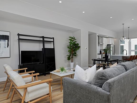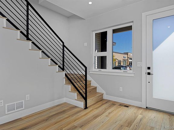 Experience modern luxury in the heart of Denver's popular Central Park neighborhood. This brand-new townhome in Central Park blends sleek contemporary design with effortless livability and exceptional craftsmanship. Sunlight floods the open-concept main floor, where the kitchen, dining, and living areas flow seamlessly—creating an inviting space for both everyday living and sophisticated entertaining. The chef-inspired kitchen is a true showpiece, featuring quartz countertops, a large center island, designer tile backsplash, and a premium stainless steel appliance suite. The adjacent dining area is enhanced by a custom wet bar complete with a wine fridge, sink, and floating white oak shelving—the perfect setup for dinner parties or relaxed evenings at home. Behind a sliding farmhouse-style door awaits a versatile flex space ideal for a home office, reading nook, or compact gym. Just beyond the living room, your private deck offers a quiet retreat to enjoy Colorado’s blue skies and sunshine year-round. Throughout the home, modern black railings and thoughtfully curated finishes create a cohesive, high-end aesthetic. Upstairs, you’ll find a convenient laundry area and two spacious ensuite bedrooms, each featuring generous walk-in closets and spa-inspired bathrooms with elevated tile and fixtures. Perfectly positioned in the heart of Central Park, you’re just steps from Sprouts, 29th Avenue Town Center, weekend farmers markets, parks, trails, and top-rated schools. The light rail station is only a block away, putting you 16 minutes from Downtown Denver and 22 minutes from DIA. Designed for the way you live today, this lock-and-leave residence offers the ultimate blend of urban convenience and neighborhood charm—a stunning, low-maintenance home where every detail has been thoughtfully considered. *Ask about 2/1 interest rate buydown!*