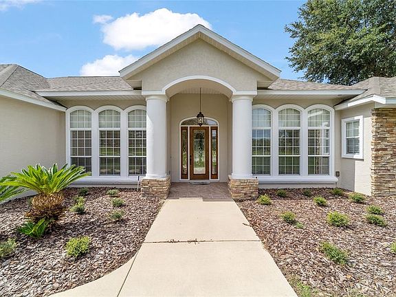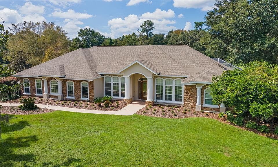 This stunning property nestled on 3.41 acres within a gated, horse-friendly community in SE Ocala combines elegance, comfort, and the opportunity to have your 4 legged friends right in your own backyard! Between the main home (3506 sq ft) and the second home (1645 sq ft) there is a combined living space of 5151 sq ft. The main home features 4 bedrooms and 3.5 baths, designed with an open floor plan that includes a family room centered around a charming stone fireplace, that flows seamlessly into the kitchen with wood cabinets and a center island surrounded by granite countertops. A cozy breakfast space just off the kitchen looks out to the newly remodeled pool and lanai. Inside, you’ll find wood flooring throughout the main living areas. This home also has a spacious primary suite, complete with two walk-in closets featuring built-ins, and a primary bath with travertine tile, dual vanities, a soaking tub and a separate shower. Best of all, it has direct access to the pool and lanai. All 3 guest bedrooms are good sized and have ample closet space. The main home also includes a formal living and dining room, plus a separate office/study. Accessible from multiple points in the home, the newly remodeled screen enclosed pool with waterfall and water features is surrounded by new pavers and covered lanai, making it the perfect space for relaxing and entertaining. Pool has electric heater and salt system. Adding to the charm, is an additional 1,645 sq ft detached home, which is currently set up as an entertainment space, complete with a built-in bar, spacious living area, and a separate theater room. This versatile area could easily be transformed into a guest house, with a half bath already in place. Recent updates include fresh paint inside and out, a new roof in 2022, updated air-conditioning units (5 ton in 2021 and 2.5 ton in 2018), along with new duct work. Equestrians will appreciate the 4-board fencing, making this property as horse-friendly as it is beautiful. This is the perfect spot for those seeking luxury and functionality in a picturesque country setting.