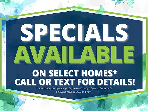 - Special offer! Specials Available on select homes! Call for text for details! *Restrictions apply. Specials, pricing and availability subject to change daily. Contact the leasing office for details.
