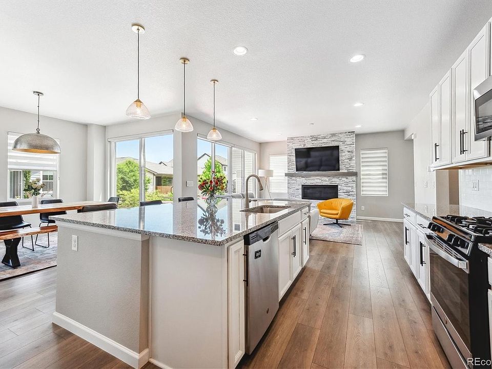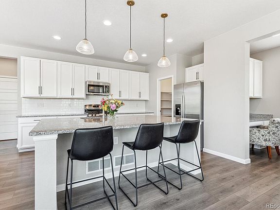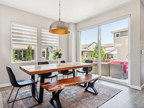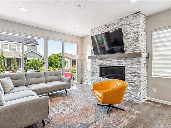 Major Price Improvement!! Discover modern living in this beautifully upgraded two-story home in the sought-after Sterling Ranch community. Built in 2020, this home combines contemporary design with everyday functionality. The main floor features updated light fixtures, engineered hardwood, and a bright and open living room with a stunning floor-to-ceiling stacked stone fireplace. The gourmet kitchen is equipped with white cabinets, granite countertops, gas stove, stainless steel appliances, and a walk-in pantry. A full wall of glass sliders in the kitchen/living room area opens to the back patio, creating a seamless indoor/outdoor living experience. Just off the kitchen you’ll find a convenient built-in workstation with extra cabinet space and a half bath completes the main level. Upstairs, the spacious primary suite is a luxurious retreat with tray ceilings, a 5-piece bath and large walk-in closet. Two additional bedrooms, a full bath, and a laundry room provide comfort and convenience for the whole family. The professionally finished basement boasts 9' ceilings and $54K in finishings for the large open family room/media space, additional bedroom, extra storage space, and full bath, perfect for guests or additional living space. Enjoy the beautiful Colorado weather in the professionally landscaped backyard featuring $22k of upgrades including large boulders and shrubbery, a spacious patio and additional stamped concrete patio space, perfect for entertaining! Sterling Ranch offers manicured grounds, scenic walking paths, a community pool, clubhouse, playgrounds, and a fantastic location near shops, restaurants, Chatfield Reservoir, and easy access to C-470 for quick mountain adventures.