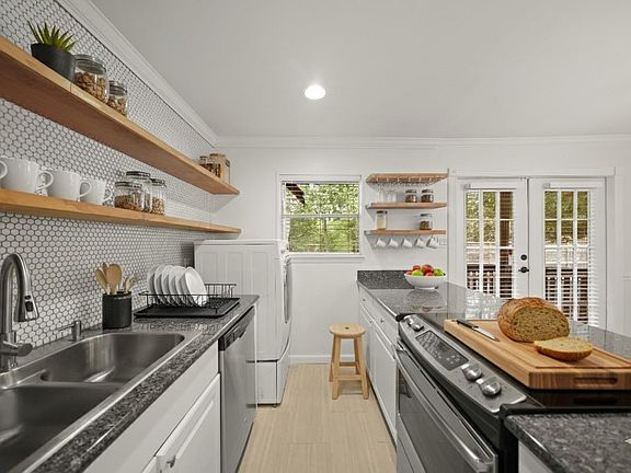 Lots of natural lightFreshly painted wallsLaminate flooringOutdoor patioOpen and airy floorplanModern stainless steel appliancesOpen shelving