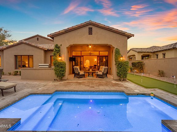 The kitchen is a chef's dream, complete with granite countertops and Vikings Appliances including a built in Viking Refrigerator. The great room, dining area, and kitchen create a perfect space for entertaining with double sliding glass panels that open to a resort backyard with jaw dropping mountain views. Backyard is complete with built in BBQ, firepit, putting green, and electronic privacy/sunshade. The main home is all on one level with a private guest casita above the garage with it's own entrance and balcony. This is the perfect space to invite your close friends and family for a one of kind golf getaway while not completely intruding on your privacy.