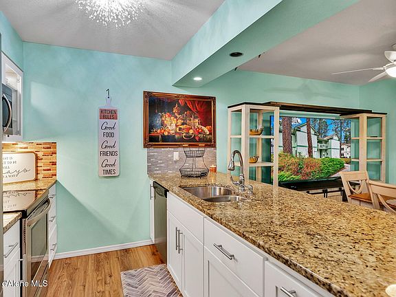 cabinets, under-cabinet lighting, new backsplash, updated light fixtures, granite countertops, and fresh paint throughout the home. Step into your private on-suite including a new vanity, shower tile, and light fixtures. Enjoy views of the sunset and bountiful wildlife from your private balcony. A single car garage offers abundant storage with additional parking available. Loch Haven Village provides two swimming pools, two tennis courts, nature trails, and more. Just minutes to Hayden Lake, shopping, parks,