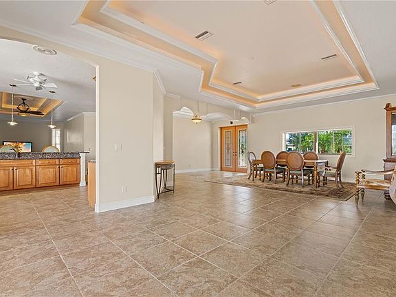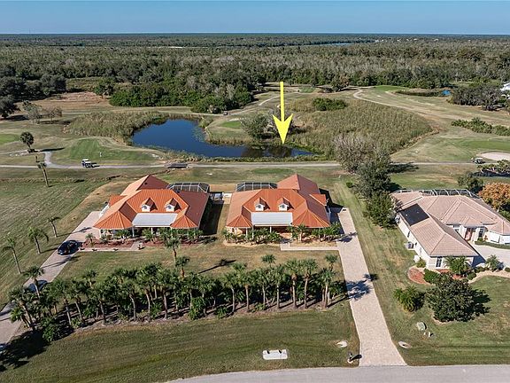 CUSTOM HOME W/ICF CONSTRUCTION, NEW 2025 METAL ROOF & SUNSET GOLF COURSE VIEWS Located in The Habitat, a deed-restricted community overlooking the Sunny Breeze Golf Course, this custom 3 bed/2 bath home blends energy-efficient construction with a timeless design. Built with ICF (Insulated Concrete Forms) for superior durability, insulation, and storm protection, the residence offers 2,598 sq ft under air and over 5,000 sq ft total—providing generous living spaces set on over half an acre. A long paver drive leads to the columned front porch framed by mature palms. Inside, the home opens to a bright, elegant layout with porcelain tile flooring, double tray ceilings with accent lighting, crown molding, arched doorways, and wide baseboards throughout the main living areas. Walls of sliding glass doors draw your eye out to the lanai and the sweeping golf course and pond views beyond. The spacious kitchen sits at the heart of the home with warm wood cabinetry w/soft close features, granite counters, stainless steel appliances, pendant lighting, and breakfast bar seating. A breakfast nook with large aquarium-style window overlooks the lanai and golf course views. The split-bedroom design enhances privacy. The master suite features a tray ceiling, French doors to the lanai, and tranquil views. The spa-inspired bath includes granite counters, abundant cabinetry, a jetted soaking tub, and an oversized walk-in shower with multiple shower heads and a glass block wall. Two guest bedrooms share the opposite wing, both with easy access to the full guest bath. Almost every room in the home opens to the lanai extending the living space outdoors, where a large brick paver deck creates the perfect setting for true Florida-style indoor/outdoor living. The covered seating area, finished with tongue-and-groove–style ceiling panels, provides a comfortable spot to relax throughout the day. The lanai is plumbed for a summer kitchen with water and electric hook-ups already in place, giving you everything needed to create an outdoor cooking space when ready. With its oversized footprint, this area offers plenty of room for dining, lounging, and enjoying the golf course and pond views—plus ample space to add a pool, if desired. Recent updates deliver peace of mind, including a NEW 2025 metal roof, NEW gutters & soffits (2025), fresh exterior paint (2025), and a NEW garage door opener (2025). Additional highlights include an oversized two-car garage w/epoxy floor and a low-fee HOA. The Habitat community enjoys a manicured, tree-lined entrance and boasts underground utilities. This move-in ready home features a quiet, countryside setting yet offers easy access to Punta Gorda, Port Charlotte & Arcadia. Liverpool Park located right down the street, offers boat ramp with quick access to the Peace River, Charlotte Harbor and the Gulf. A rare opportunity to enjoy energy-efficient construction, modern updates, and a premium golf course location. Make an appointment today.