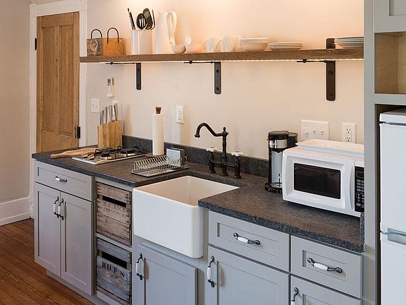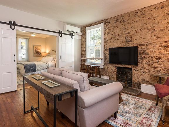 Inside, you'll find a space full of character and comfort. Thoughtful details such as exposed brick, antique heart pine floors, barn doors, and a farm sink lend a rustic charm, while calming blue and gray tones in the bedroom create a tranquil retreat. Unique touches like apple crate drawers and shelving made from reclaimed materials add to the apartment's timeless appeal.