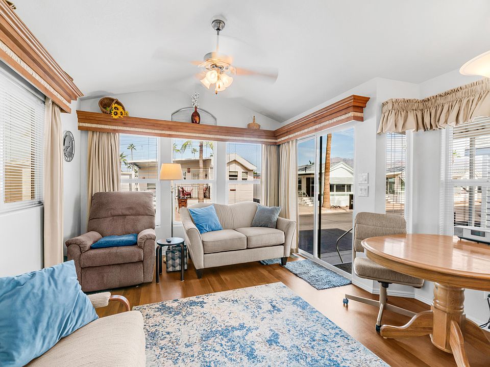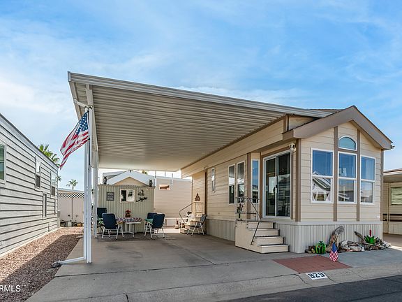 Get ready to fall in love with this lively north facing Golden Vista gem that shows off those gorgeous Superstition Mountain views every single day & sits just steps from the clubhouse so you can wander over in seconds for whatever fun is happening. The moment you step inside, you'll notice the solid surface wood look flooring that runs throughout the entire home & the tape & textured wall finishes that give everything a polished cozy vibe. Vaulted ceilings open the space up beautifully & the double paned windows keep things bright while helping the home stay comfortable. The kitchen is set up with a full sized ceramic cooktop stove & built in microwave so you can whip up a meal or at least have a good reason to pretend something delicious might be happening in there. The bedroom offers a comfy queen sized bed with lots of built ins including a dresser with pullout drawers tucked under mirrored closet doors because storage is life. The bathroom is just the right size with a tub shower combo that invites you to relax instead of rush. Outside, the detached shed gives you extra space with a washer & dryer & the over height carport delivers an amazing outdoor seating area perfect for soaking up that dreamy Arizona weather while hanging out with friends. Golden Vista itself is packed with good times from the sparkling pool & rejuvenating spa to pickleball, tennis, fitness rooms, arts & crafts, woodworking, shuffleboard, card games, clubs galore & a social calendar that stays full enough to keep you smiling. Fully furnished, simply charming, & located in one of the most amenity packed communities around, this home is your ticket to fun, sunshine, & a whole new chapter of adventure.