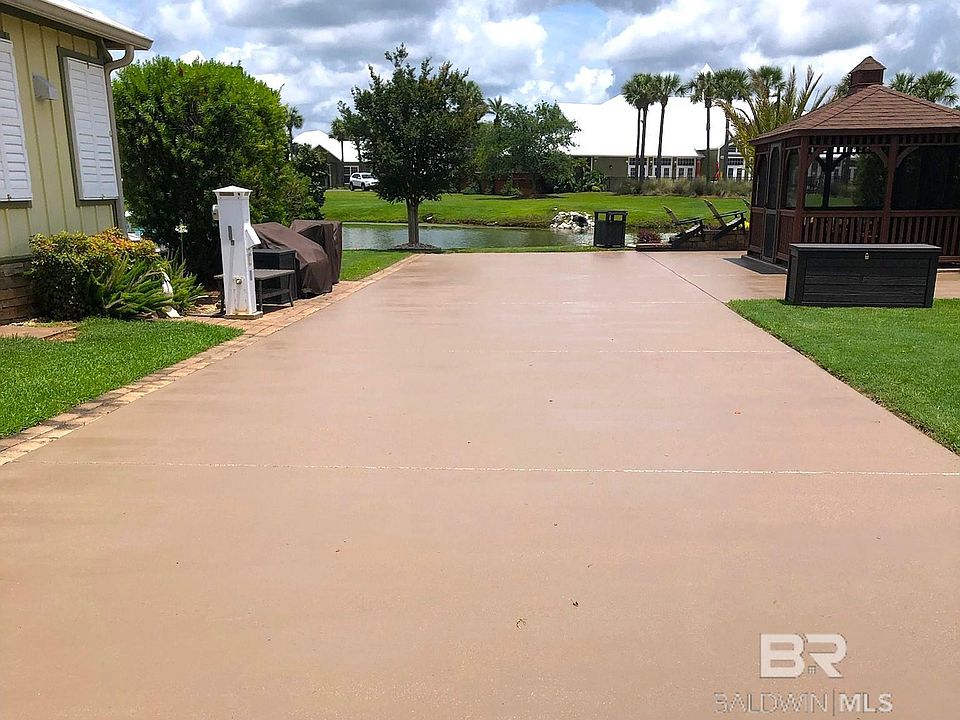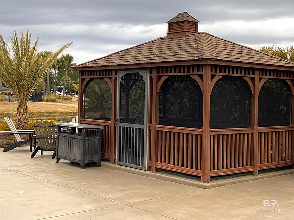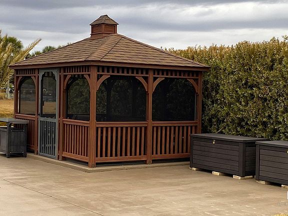 Luxury Class A (15 years or newer & 32' or greater in length) and SUPER C (10 yrs or newer & 32' or greater in length) Motor Coach Resort rated #1 in the South and in the Top 5 RV Resorts in the United States. This North-facing Coach Estate site is ideally situated on the resort's West peninsula and offers a beautiful view of the lake & fountain. The lot features a 10' x 14' screened gazebo with a cushioned wicker conversation set including a love seat, two chairs and coffee table. The extended patio has four Breezesta Adironack chairs with table for enjoying the view across the lake. For added convenience to your outdoor living, there is a utility cart that can be used to hold all of your grilling items. Additional features include two large deck storage boxes, a stacked block retaining wall and custom irrigated landscaping. The pad and patio were freshly painted June 2024. There is ample space for additional upgrades such as an outdoor kitchen or casita. Resort amenities include a 6,000 sq ft clubhouse, zero entry infinity edge pool, hot tub, well-appointed fitness center, wet/dry sauna, movie theater room, stocked lake, dog parks & dog wash, and daily activities for guests. Low COA fees and property tax! Buyer to verify all information during due diligence.