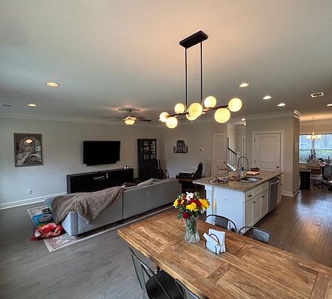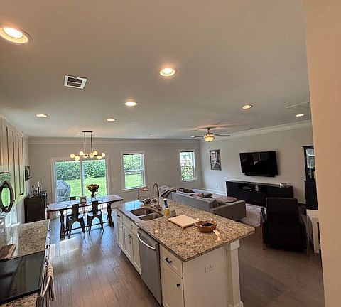 Large great roomStainless steel appliancesShaker-style cabinetsOpen-concept livingWainscoting detailSpacious master suiteSeparate dining room