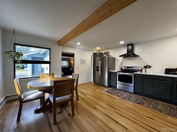 Quaint 2-bedroom home located on a quiet dead-end street with a peekaboo view of Lake Superior! This charming home has seen many updates in recent years, with several rooms completely renovated featuring new drywall, fixtures, flooring, doors, and trim. The newly remodeled kitchen offers modern vinyl plank flooring, stainless steel appliances, marble-style laminate countertops, and recessed lighting. The durable vinyl plank flooring continues into the living room and front bedroom—both offering beautiful sunset views! The back bedroom features warm wood-style laminate flooring and overlooks the backyard. The backyard is really nice, with a small garden off the deck featuring strawberries, chives, and wildflowers that will come back year after year! There’s also a great storage shed for garden tools, plus a detached garage with power and a handy workbench. The partial paved driveway received new gravel this past fall. A new boiler was installed in October 2022. With just a little exterior TLC, this cozy home could truly have it all! Owner is a licensed Realtor.