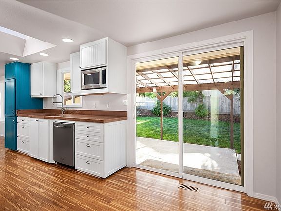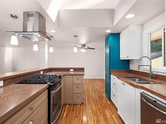 Remarkable midcentury gem w/ airy layout & countless refined updates. Open-concept main flr w/ walls of windows, incredible flow for entertaining, handsome wood fire. Crisp style throughout: new bamboo flrs, white cabinets, SS apps. Lovely finished basement for office/den/MIL suite. Manicured landscaping, lush fenced lawn, covered patio. Bonuses: boat/RV space, 2-car garage, newer roof, A/C, fresh paint. Fabulous location in flourishing Kent near parks, shopping, dining. Easy commute. Must see!