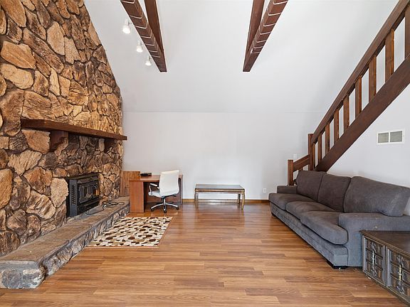 Much larger than it appears from the front with the upper floor addition. Enter into the great room with soaring vaulted ceiling and fireplace. Open to kitchen with plenty of counter space and a concrete counter top and new backsplash. 3 bar stools included in the sale. Stone fireplace is the focal point and a stair case that leads to owner suite. Down stairs you will find a traditional living room or home office 2 additional bedrooms and a full updated bath. Laundry in basement which has lots of potential for more living space. Plenty of off street parking at rear of driveway with a detached garage that has an attached workshop area. Spacious backyard for outdoor activities.