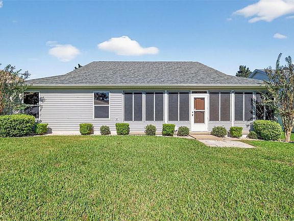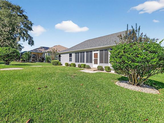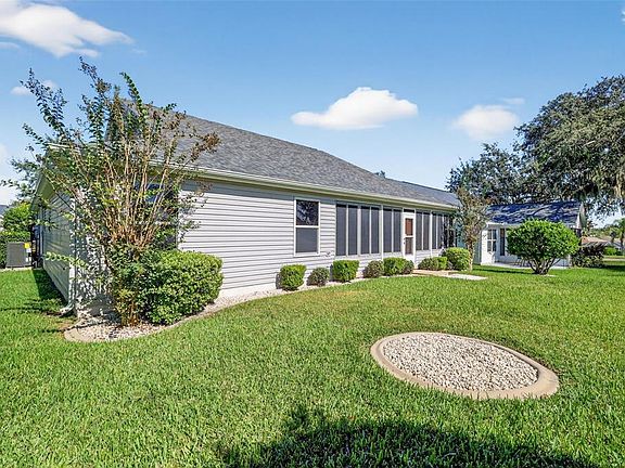 One or more photo(s) has been virtually staged. 2025 HVAC • 2020 ROOF • 2021 WATER HEATER • NO BOND • ALARM SYSTEM • 2021 APPLIANCES • ENCLOSED LANAI • ROOM FOR POOL. This 3-bedroom, 2-bath, Begonia Designer Home offers 1,918 sq ft of open-concept living in The Villages with mature landscaping and curb appeal. Every detail has been carefully maintained, from the roof to the floors, showing a clear commitment to quality living. The kitchen features a center island, breakfast bar, laminate counters, stainless steel appliances, and a bright breakfast nook. The open living/dining space includes laminate flooring, decorative columns, and a stunning Italian chandelier. Enjoy the spacious primary suite with dual walk-in closets, an ensuite bath with dual sinks, and updated porcelain tiled flooring & shower. Bedroom 2 features a built-in closet, carpet, and ceiling fan. Bedroom 3 is carpeted with a ceiling fan. The guest bath has updated tile flooring and a tub/shower combo. Enjoy the enclosed lanai with ceramic tile floors and a beautiful stained-glass window. The inside laundry and 2-car garage with attic storage, and an alarm system add convenience. EXTRA BONUS- This home is partially furnished! Just bring your toothbrush and start enjoying The Villages lifestyle. Located near Mulberry Grove Rec Center, Chatham Pool, and Nancy Lopez Golf.